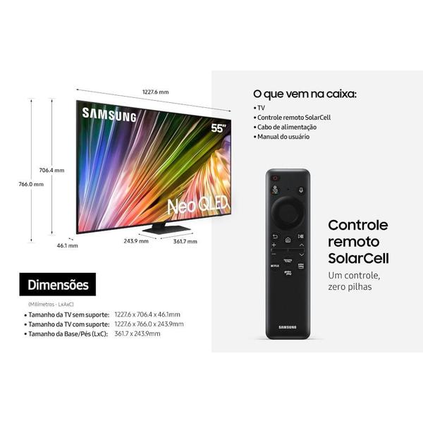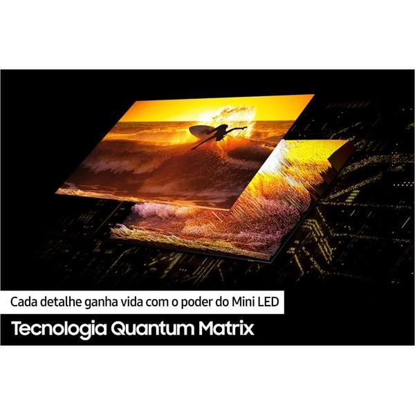 Ainda conta com processador NQ4 AI Gen2 Processor, Upscaling 4K, Mini LED, AI Energy Mode, Som em Movimento Virtual, Dolby Atmos, 4 entradas HDMI e 2 USB.