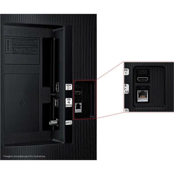 - 2 HDMI, 1 USB-A, Canal de Retorno de Áudio HDMI: eARC, Anynet+ (HDMI-CEC), 1 Ethernet (LAN), Entrada de RF (terrestre/entrada de cabo): 1 / 1 (Uso Normal para o Terrestre) / 0