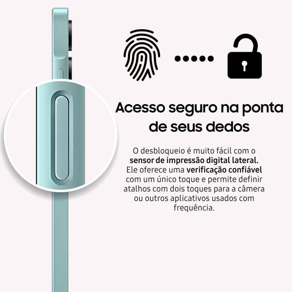 A bateria de longa duração de 5000mAh, garante que você use o smartphone o dia todo sem se preocupar com recargas. E com o carregamento rápido compatível com 25W, você recupera a carga rapidamente quando precisa. Ele também possui o Cadeado Galaxy, que protege seus dados com segurança. Desbloqueie a tela facilmente com o leitor de impressão digital.