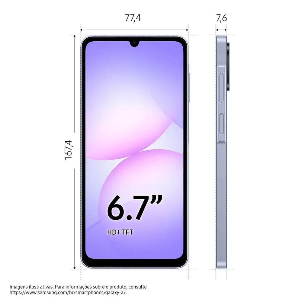 Smartphone Samsung Galaxy A07 128GB - Violeta, 4g, Ram 4gb, Câmera 50mp + Selfie 8mp, Tela 6,7"