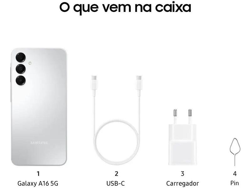 O Samsung Galaxy A16 4G Cinza é um smartphone com ótimas características para quem busca um aparelho intermediário. Conheça o novo Galaxy A16, o smartphone que foi feito para durar. Com certificação IP54, até 6 atualizações de Android e Segurança e uma tela Super AMOLED FHD+ de 6.7”, o Galaxy A16 permite que você mergulhe no seu conteúdo favorito com cores vívidas e uma tela ampla. Experimente o processador Helio G99, 128GB de armazenamento, 4GB de memória RAM e 4GB adicionais de RAM Plus. Tenha em mãos uma carteira inteligente no seu novo Galaxy A16, para pagamentos rápidos e seguros por aproximação com NFC. A Samsung Wallet permite que você organize todos os seus itens essenciais em um único aplicativo. Carregue rápido e fique conectado por muito mais tempo, aproveitando todos os seus conteúdos sem se preocupar. O Galaxy A16 conta com uma bateria de 5.000 mAh, de longa duração e que suporta o Carregamento Super-Rápido de até 25W. O smartphone ainda conta com Câmera Tripla de múltiplas possibilidades, sendo sua câmera principal de até 50MP com Ultra Wide e a Selfie de 13MP, permitindo a captura de memórias vivas e realistas. Com seu design único com um acabamento mais fino e elegante, o novo Galaxy A16 é o smartphone que possui diversas funcionalidades, sendo versátil e compatível com seu estilo. Sua proteção ainda é aprimorada com Samsung Knox Vault, garantindo que dados confidenciais e sigilosos permaneçam seguros, e, com Cadeado Galaxy, protegendo os seus dados e acessos a aplicativos por terceiros. E com o aplicativo SmartSwitch, você transfere de forma fácil e prática o conteúdo do seu celular anterior (fotos, contatos, eventos do calendário, notas, configurações do dispositivo e muito mais) para o seu novo Galaxy A16. Ele é um smartphone completo, com ótimas características para quem busca um aparelho intermediário. Ele é ideal para quem quer um celular com tela grande, boa câmera e bateria de longa duração. Não acompanha fone de ouvido.