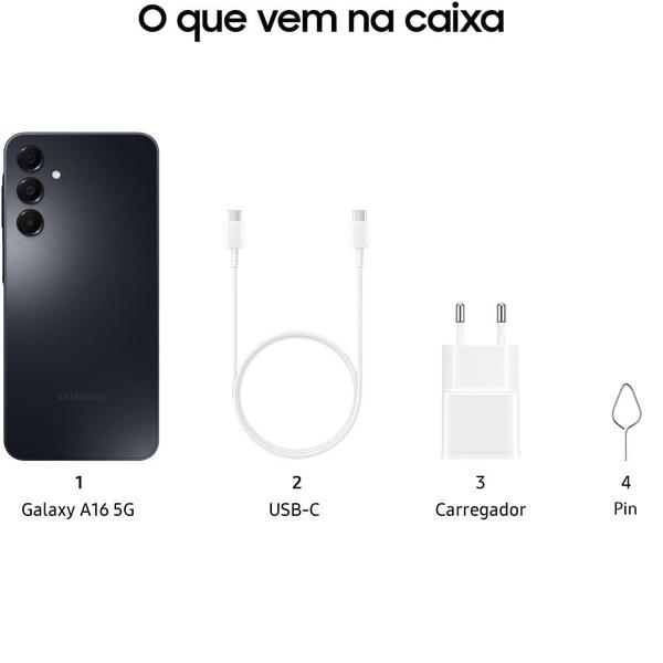 O Samsung Galaxy A16 4G Preto é um smartphone com ótimas características para quem busca um aparelho intermediário. Conheça o novo Galaxy A16, o smartphone que foi feito para durar. Com certificação IP54, até 6 atualizações de Android e Segurança e uma tela Super AMOLED FHD+ de 6.7”, o Galaxy A16 permite que você mergulhe no seu conteúdo favorito com cores vívidas e uma tela ampla. Experimente o processador Helio G99, 128GB de armazenamento, 4GB de memória RAM e 4GB adicionais de RAM Plus. Tenha em mãos uma carteira inteligente no seu novo Galaxy A16, para pagamentos rápidos e seguros por aproximação com NFC. A Samsung Wallet permite que você organize todos os seus itens essenciais em um único aplicativo. Carregue rápido e fique conectado por muito mais tempo, aproveitando todos os seus conteúdos sem se preocupar. O Galaxy A16 conta com uma bateria de 5.000 mAh, de longa duração e que suporta o Carregamento Super-Rápido de até 25W. O smartphone ainda conta com Câmera Tripla de múltiplas possibilidades, sendo sua câmera principal de até 50MP com Ultra Wide e a Selfie de 13MP, permitindo a captura de memórias vivas e realistas. Com seu design único com um acabamento mais fino e elegante, o novo Galaxy A16 é o smartphone que possui diversas funcionalidades, sendo versátil e compatível com seu estilo. Sua proteção ainda é aprimorada com Samsung Knox Vault, garantindo que dados confidenciais e sigilosos permaneçam seguros, e, com Cadeado Galaxy, protegendo os seus dados e acessos a aplicativos por terceiros. E com o aplicativo SmartSwitch, você transfere de forma fácil e prática o conteúdo do seu celular anterior (fotos, contatos, eventos do calendário, notas, configurações do dispositivo e muito mais) para o seu novo Galaxy A16. Ele é um smartphone completo, com ótimas características para quem busca um aparelho intermediário. Ele é ideal para quem quer um celular com tela grande, boa câmera e bateria de longa duração. Não acompanha fone de ouvido.