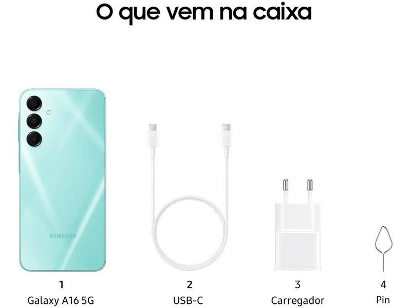 O Samsung Galaxy A16 5G Verde Claro é um smartphone com ótimas características para quem busca um aparelho intermediário. Conheça o novo Galaxy A16 5G, o smartphone que foi feito para durar. Com certificação IP54, até 6 atualizações de Android e Segurança e uma tela Super AMOLED FHD+ de 6.7”, o Galaxy A16 5G permite que você mergulhe no seu conteúdo favorito com cores vívidas e uma tela ampla. Experimente o processador Exynos 1330, 128GB de armazenamento, 4GB de memória RAM e 4GB adicionais de RAM Plus. E, com o 5G, experimente uma velocidade absurda. Tenha em mãos uma carteira inteligente no seu novo Galaxy A16 5G, para pagamentos rápidos e seguros por aproximação com NFC. A Samsung Wallet permite que você organize todos os seus itens essenciais em um único aplicativo. Carregue rápido e fique conectado por muito mais tempo, aproveitando todos os seus conteúdos sem se preocupar. O Galaxy A16 5G conta com uma bateria de 5.000 mAh, de longa duração e que suporta o Carregamento Super-Rápido de até 25W. O smartphone ainda conta com Câmera Tripla de múltiplas possibilidades, sendo sua câmera principal de até 50MP com Ultra Wide e a Selfie de 13MP, permitindo a captura de memórias vivas e realistas. Com seu design único com um acabamento mais fino e elegante, o novo Galaxy A16 5G é o smartphone que possui diversas funcionalidades, sendo versátil e compatível com seu estilo. Sua proteção ainda é aprimorada com Samsung Knox Vault, garantindo que dados confidenciais e sigilosos permaneçam seguros, e, com Cadeado Galaxy, protegendo os seus dados e acessos a aplicativos por terceiros. E com o aplicativo SmartSwitch, você transfere de forma fácil e prática o conteúdo do seu celular anterior (fotos, contatos, eventos do calendário, notas, configurações do dispositivo e muito mais) para o seu novo Galaxy A16 5G. Não acompanha fone de ouvido.