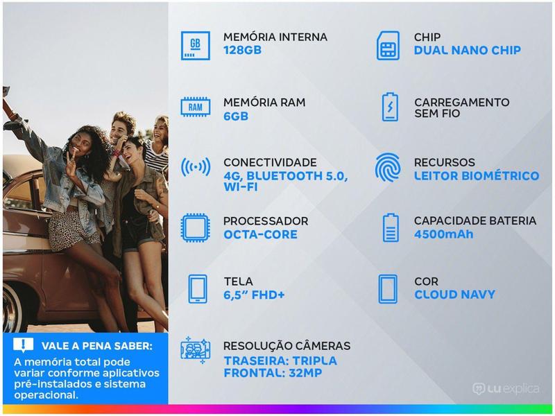 Esse produto da Samsung é tudo que você pediu de um celular e com uma experiência revolucionária! Um enorme avanço na resolução de fotografias, entregando fotos profissionais a qualquer hora, pois o Galaxy S20 FE conta com um conjunto de três câmeras na parte de trás, permitindo cliques perfeitos e sem grande esforço, independente do ambiente. A câmera frontal de 32 megapixels oferece tecnologia de nível profissional, para que as selfies tenham o máximo de criatividade. Com 128GB de armazenamento interno, ele é perfeito para guardar todas suas fotos, músicas ou vídeos. Se ainda achar pouco, utilize um cartão MicroSD de até 1TB para expandir essa capacidade! Seu processador é Qualcomm Snapdragon 865 Octa-Core e em conjunto dos 6GB de memória RAM melhoram sua experiência de uso devido a sua combinação poderosa de hardware e software. Sua tela de 6,5" com resolução FHD+, Super AMOLED entregam um display grande e imersivo ao assistir seus filmes e suas séries favoritas com o máximo de qualidade. Permaneça sempre conectado nas redes sociais com a tecnologia 4G em um aparelho dual chip! Sua bateria é de 4500mAh, lembrando que a duração da bateria pode variar de acordo com o uso. Este celular tem proteção personalizada com leitor de impressão digital na tela, deixando seus conteúdos e dados confidenciais protegidos com máxima segurança. A cor Cloud Navy é épica e destaca o design premium do smartphone, garantindo maior elegância em suas mãos.