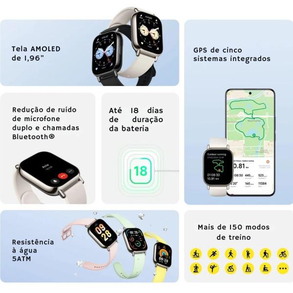 - Monitoramento de Saúde, NFC (exceto para pagamentos), 100+ Modos de Exercício, Conectividade Inteligente, Notificações de chamadas, mensagens, apps, Controle de música