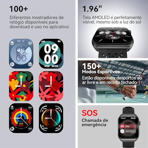 Smartwatch Relógio inteligente Masculino, Tela AMOLED, ChatGPT, Relogio Inteligente, 120+ Modos Esportivos, Chamadas Bluetooth, Compatível com iOS e Android, 2 Pulseiras (Preto+cor laranja)