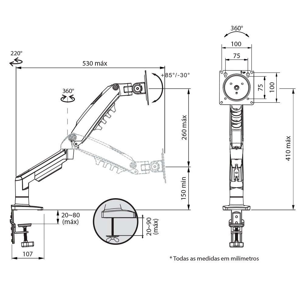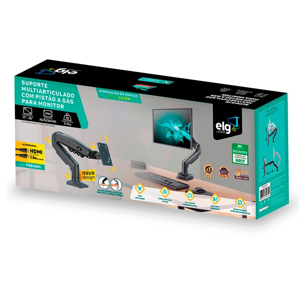 O suporte multiarticulado de mesa ELG modelo F98HDMI possui um sistema de braço articulado com pistão a gás, o qual possibilita diversos ajustes e movimentos de forma leve e prática. É compatível com monitores de 17" a 35", com peso entre 2Kg a 9kg que permitam instalação na traseira do monitor, conforme os padrões de fixação VESA* 75x75 e 100x100mm (HxV).