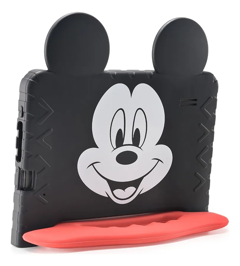 O Tablet Infantil Mickey vem com uma case emborrachada e com alça que protege o dispositivo e garante mais conforto e segurança.