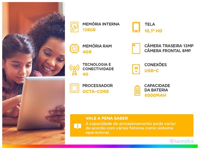 Ele oferece conectividade completa com conectividade Wi-Fi e Bluetooth, além da tecnologia 4G, onde pode navegar, assistir e compartilhar conteúdo onde estiver. Versátil para toda a família. Com suporte a controle parental e recursos do Google Kids Space, as crianças podem aprender e se divertir com segurança. Acompanha case protetora para manter seu tablet sempre seguro e bem conservado.