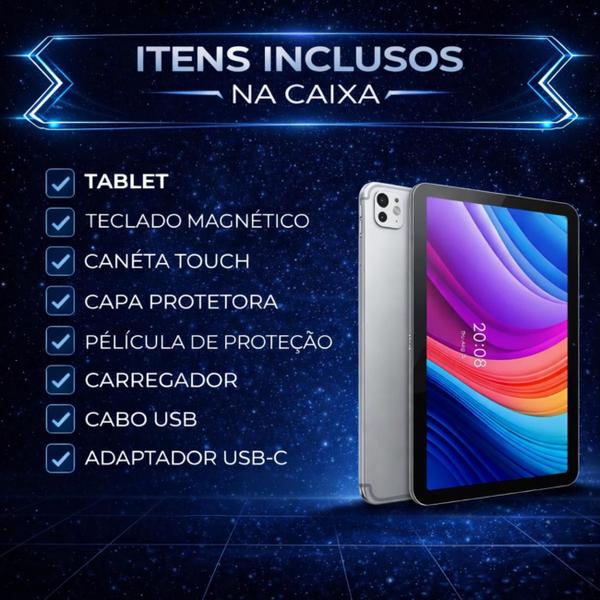 - 1 Tablet Oteeto 15 Ultra, 1 Teclado, 1 Caneta touch, 1 Capa protetora, 1 Película de proteção, 1 Carregador, 1 Cabo USB-C, 1 Manual