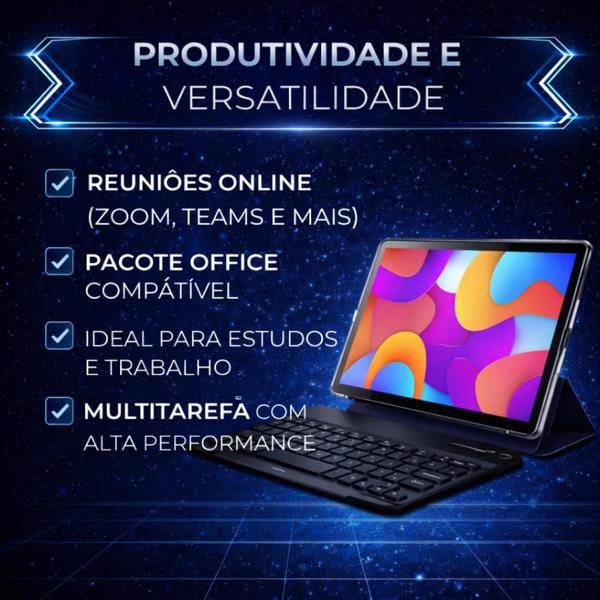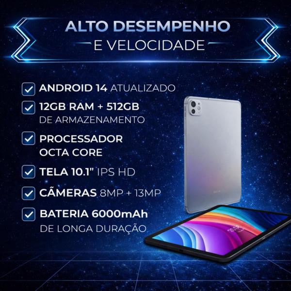 Com processador Octa Core, 12GB de RAM e tela IPS de 10,1”, o tablet oferece bom desempenho para jogos, vídeos, streaming e navegação, garantindo uma experiência estável e agradável.