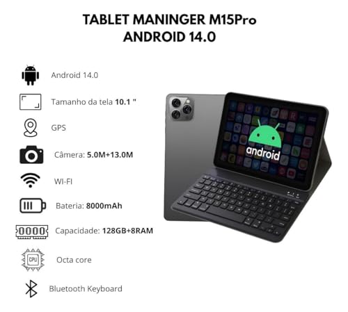 Tablet PC 10.1" / Android 14/8 GB RAM / 128 GB, Bateria 8000mAh, Processador Octa Core, Câmera Traseira 13 MP, Dual Chip, acompanha Capa, Teclado, Caneta, Fones de Ouvido, Mouse