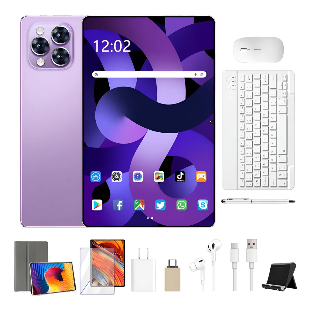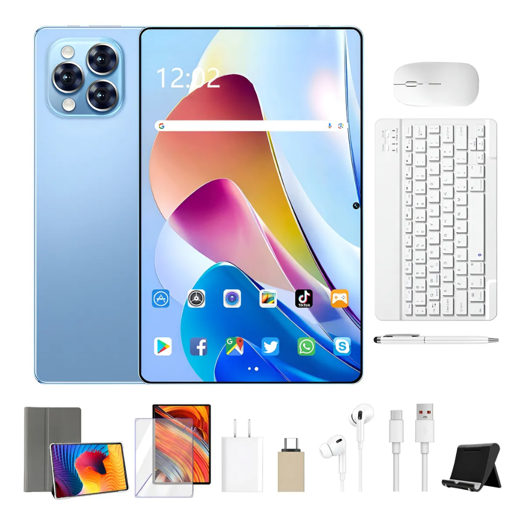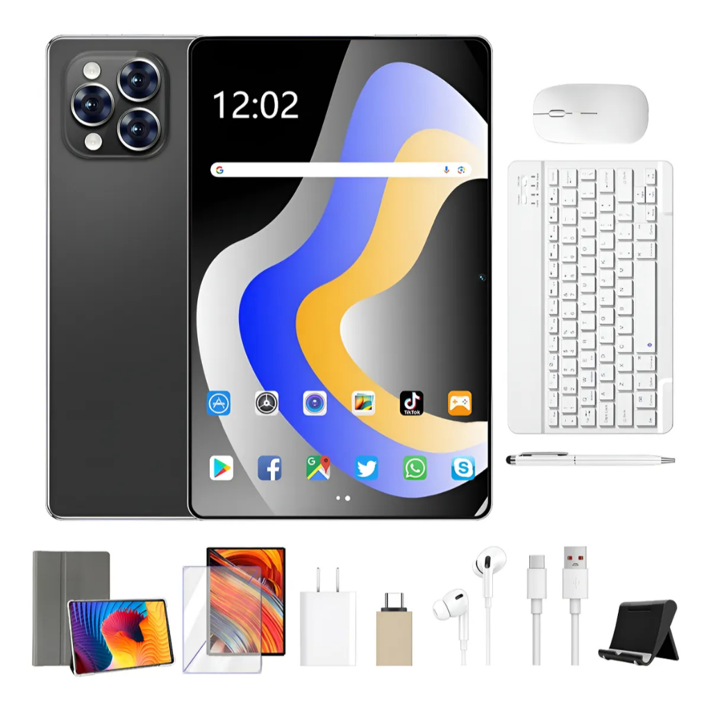 Peça agora e receba: teclado Bluetooth, mouse Bluetooth, carregador, cabo de dados, fones de ouvido, película protetora, suporte, estojo de couro, caneta capacitiva, adaptador TPC, caixa de embalagem, manual de instruções