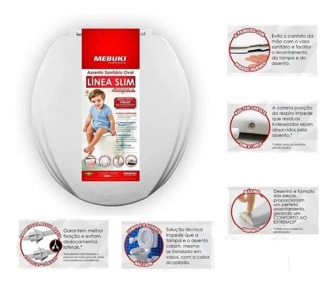 - Conteúdo da Embalagem1 assento Sanitário Almofadado Branco Oval/Universal Mebuki, linha Línea Slim; 1 Kit de FixaçãoCorBrancoDimensões do ProdutoComprimento: 44cm; Largura: 38cm; Distância entre parafusos de fixação: 12,5 a 15,5cmFechamentoNão possui fech