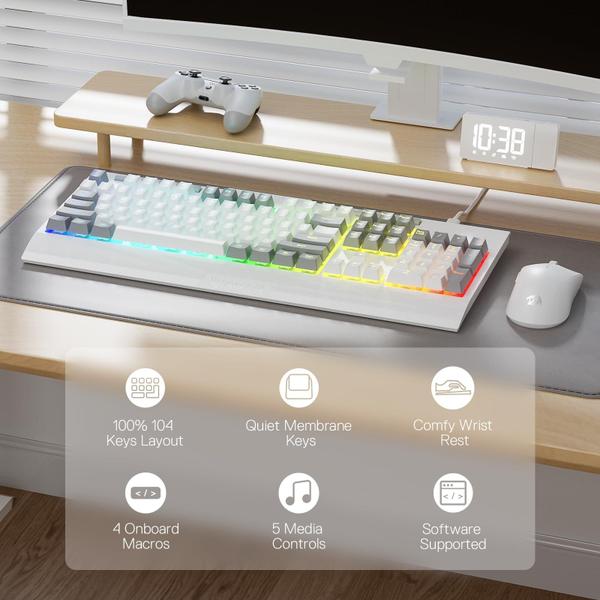 Redragon Teclado para jogos de membrana retroiluminado RGB K525 com teclas multimídia, interruptor mecânico linear, 4 teclas macro extras integradas, controle de mídia dedicado, descanso de pulso removível - 4 teclas macro integradas – 4 teclas macro integradas (G1~G4) são programáveis e funcionam rapidamente sem nenhum software adicional. As teclas são fáceis de editar e podem executar uma variedade de macros diferentes. - Verdadeira luz de fundo RGB – retroiluminação RGB totalmente dinâmica permite inúmeras possibilidades de iluminação limitadas apenas à sua imaginação. O teclado vem com 7 modos de iluminação predefinidos e 6 compartimentos adicionais para modos personalizáveis. A placa também permite o controle de brilho que varia de muito brilhante a completamente desligado se você não precisar da iluminação. - 26 teclas anti-fantasma e controles de mídia dedicados – com teclas anti-ghosting (teclas com um sublinhado) que permitem que 26 teclas funcionem simultaneamente para respostas rápidas e precisas do jogo da maneira que você pretendia. Os controles de mídia dedicados permitem reproduzir, pausar e pular multimídia diretamente do teclado para que seu jogo seja suave e ininterrupto. - Apoio de pulso dedicado – O descanso de pulso ergonomicamente projetado para teclados mecânicos oferece suporte ergonômico, reduzindo a tensão no pulso durante longas sessões de digitação ou jogos. Garante conforto e melhor postura. - Software profissional e durabilidade – o software está disponível para definir efeitos de luz de fundo imersivos e vívidos de acordo com o seu gosto e configurar várias funções macro. O teclado passa por 10 milhões de testes de teclas, garantindo que seja confiável para o longo prazo. As teclas moldadas por injeção dupla garantem que as teclas e letras nunca desbotem. [PRODUTO INTERNACIONAL / COMPRA INTERNACIONAL] Atenção! Este produto é de origem internacional e está sujeito aos procedimentos e regulamentações aplicáveis à importação de bens para uso pessoal no país de destino. O consumidor é responsável por garantir que o produto esteja em conformidade com quaisquer exigências locais, certificações ou autorizações necessárias para seu uso. Por favor, verifique as leis e diretrizes aplicáveis das autoridades reguladoras do seu país antes de concluir a compra.