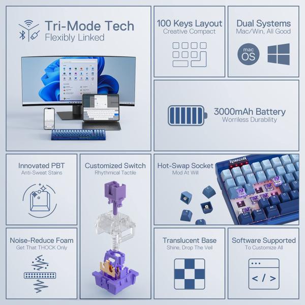 Redragon K656 PRO Teclado para jogos RGB sem fio de 3 modos, teclado mecânico de 100 teclas com placa translúcida, soquete de troca quente, espuma absorvente de som e interruptor tátil personalizado, azul gradiente feito - Conexão de 3 modos – com tecnologia avançada de conexão trimodo, USB-C com fio, BT 3.0/5.0 e modos sem fio de 2,4 GHz que tornam Redragon experiência do usuário atualizada para outro nível em todos os campos. - Layout de 100 teclas – O design de 90% mantém o layout 100% padrão original totalmente funcional, mas reduz ao máximo o espaço desnecessário. Sacrifique 4 teclas para a melhor experiência do usuário, mantendo práticas e mais compactas o máximo possível. - Troca a quente atualizada – a nova atualização com quase todos os interruptores (3/5 pinos) compatíveis, o soquete de troca a quente gratuito está disponível agora. O soquete exclusivo de próximo nível torna a montagem do interruptor mais fácil e estável do que nunca. - Interruptores roxos personalizados – Armados com o novo interruptor personalizado do próprio desenvolvimento e produção da Redragon, força de atuação de 55 g + distância pré-viagem de 1,1 mm oferece uma sensação tátil clara e forte com THOCK satisfatório. - Espuma de amortecimento de ruído - equipada com espuma absorvente de som de 3,5 mm localizada acima do PCB, que absorve a ressonância sonora entre os metais e reduz o ruído das cavidades. Cria um som de interruptor THOCK claro e puro, sem ruído extra de corda. - Hype-Blue translúcido - para combinar com a sensação de mar de verão K656, a placa translúcida na cor azul será a água do mar transparente. Para uma melhor iluminação de fundo e um visual encantador refrescante do céu do mar. - Bateria visível de 3000 mAh – Embutida uma enorme bateria de 3000 mAh para maior durabilidade, recuse a ansiedade e a preocupação com a bateria fraca. A capacidade também é "transparente" como o teclado, FN + F1 para verificar o nível da bateria a qualquer momento. - Software Pro suportado - Expanda suas opções usando o software disponível para projetar seus próprios novos modos e efeitos encontrados na Redragonshop. Macros com diferentes atalhos ou atalhos para trabalho e jogos mais eficientes.