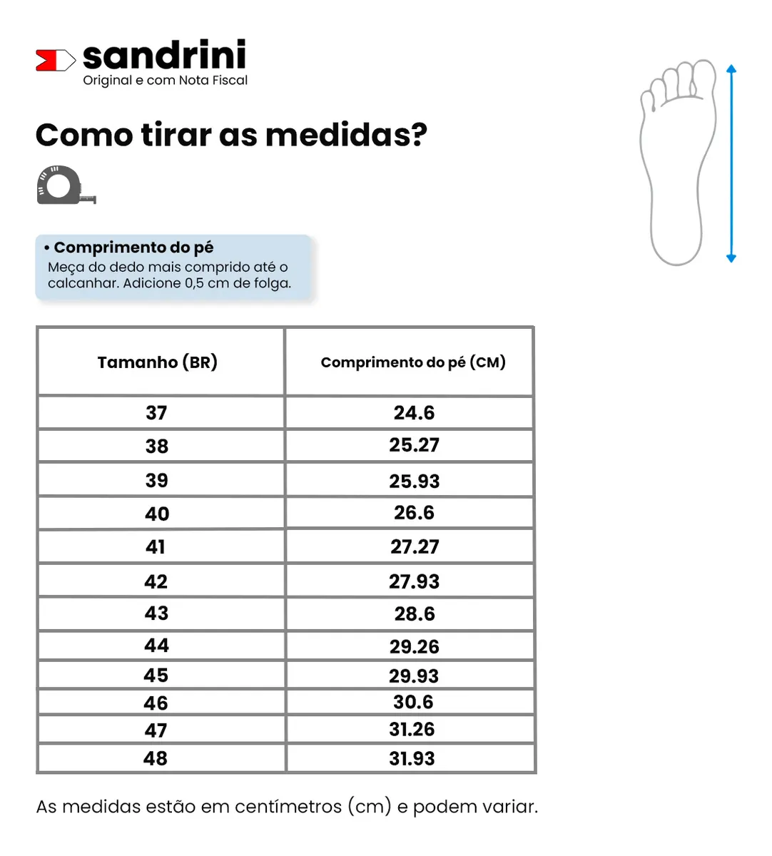 Dica: meça do calcanhar à ponta do dedo mais longo com o pé apoiado no chão; se ficar entre dois tamanhos, priorize o maior para mais conforto.