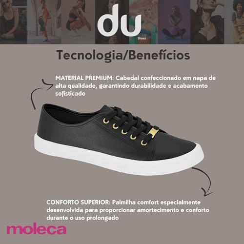 Descubra o equilíbrio perfeito entre estilo e conforto com este tênis contemporâneo. O cabedal em napa proporciona um visual refinado e durabilidade superior, complementado por elegantes ilhoses dourados que adicionam um toque de sofisticação. A palmilha comfort especialmente desenvolvida pela Moleca oferece excepcional amortecimento para uso durante todo o dia. O solado branco em borracha antiderrapante garante estabilidade e segurança em diferentes superfícies. Com seu design minimalista em preto, este calçado versátil harmoniza perfeitamente com diversos looks, seja para ocasiões casuais ou mais formais. A combinação da parte superior texturizada com a sola clean cria um visual moderno e atemporal, ideal para mulheres que buscam um tênis que una funcionalidade e elegância no dia a dia.