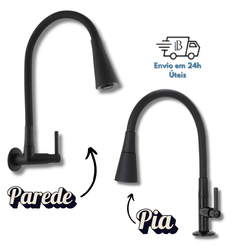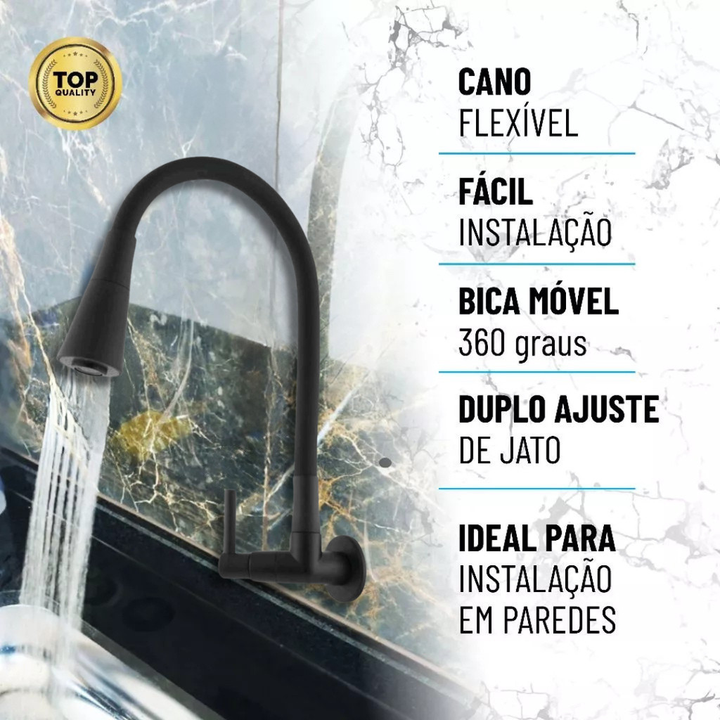 Torneira Cozinha Parede Pia Gourmet Preta Flexível Bica Móvel 2 Jatos