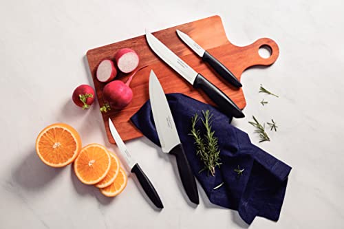 O jogo de facas Tramontina Plenus com lâminas em aço inox e cabos de polipropileno preto 04 peças será seu ajudante perfeito na hora de preparar suas refeições, sejam elas com carnes, legumes ou frutas. Perfeito para uso diário, ele é composto por facas desenvolvidas com lâminas em aço inox com tratamento térmico e devido a isso, garantem um excelente fio de corte. Os cabos são em polipropileno na cor preta, são resistentes e duráveis, podendo ainda, ir à máquina de lavar louças. Escolha Tramontina e deixe seu dia a dia na cozinha muito mais prático!