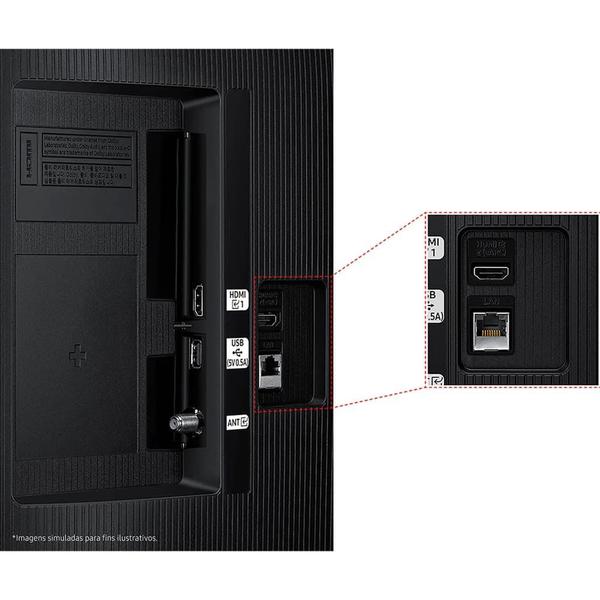 - HDMI: 2 l HDMI Audio Return Channel: eARC l Anynet+ (HDMI-CEC): Sim l 1 USB-A l Ethernet (LAN): 1 l Entrada de RF (terrestre/entrada de cabo): 1 / 1 (Uso Normal para o Terrestre) / 0