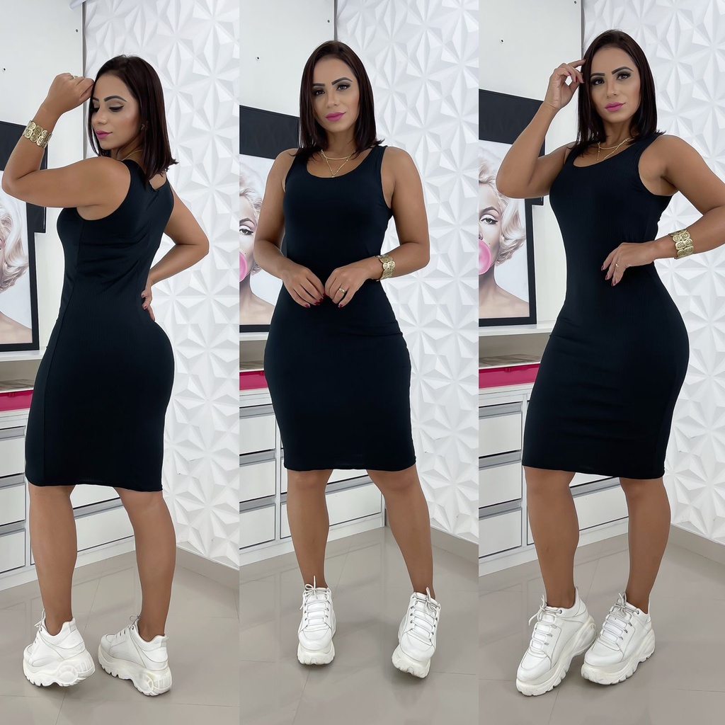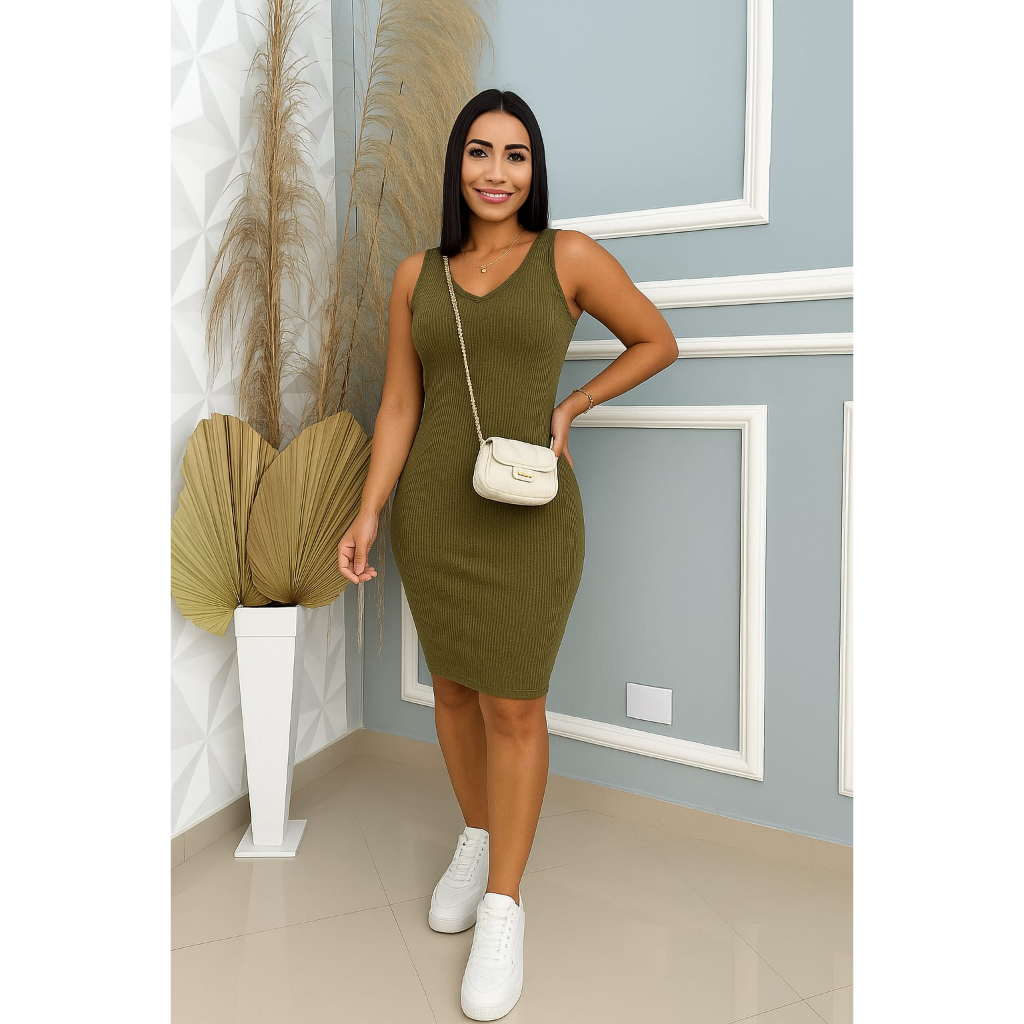 Vestido colado feminino malha canelada midi tubinho