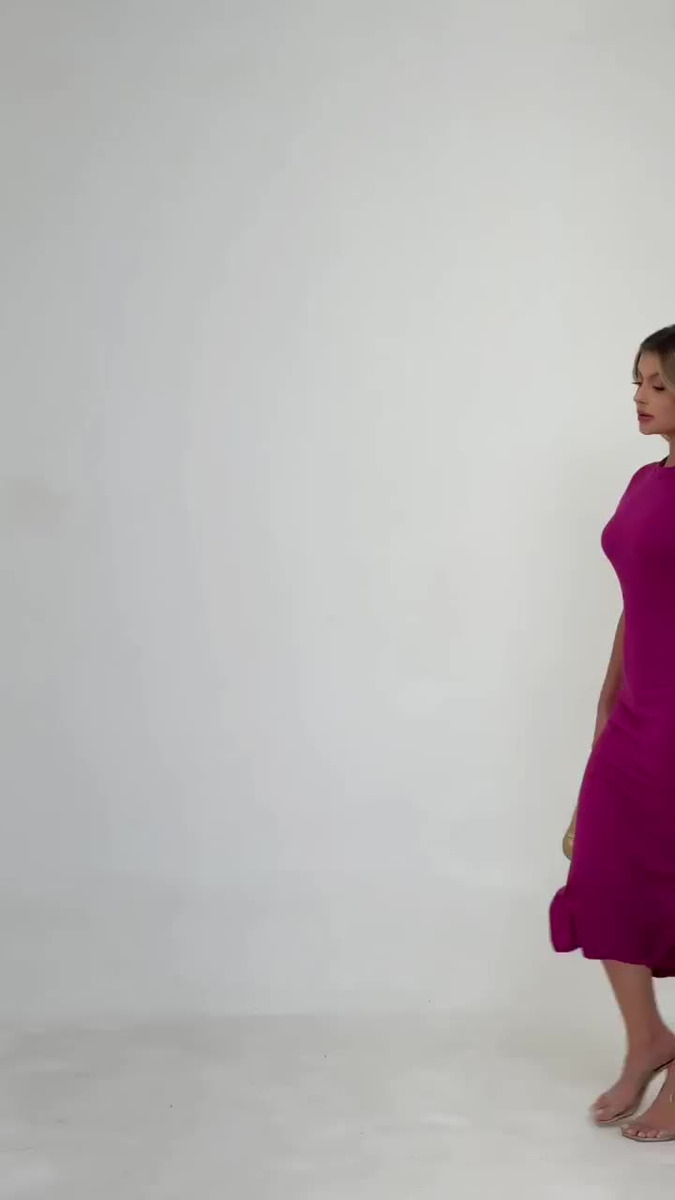 • 1 vestido midi canelado, manga curta, com modelagem ajustada e comprimento elegante.