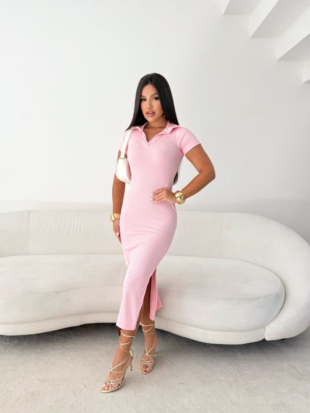 Vestido polo midi com mangas curtas, gola clássica e caimento justo ao corpo. Elegante e versátil para diversas ocasiões.