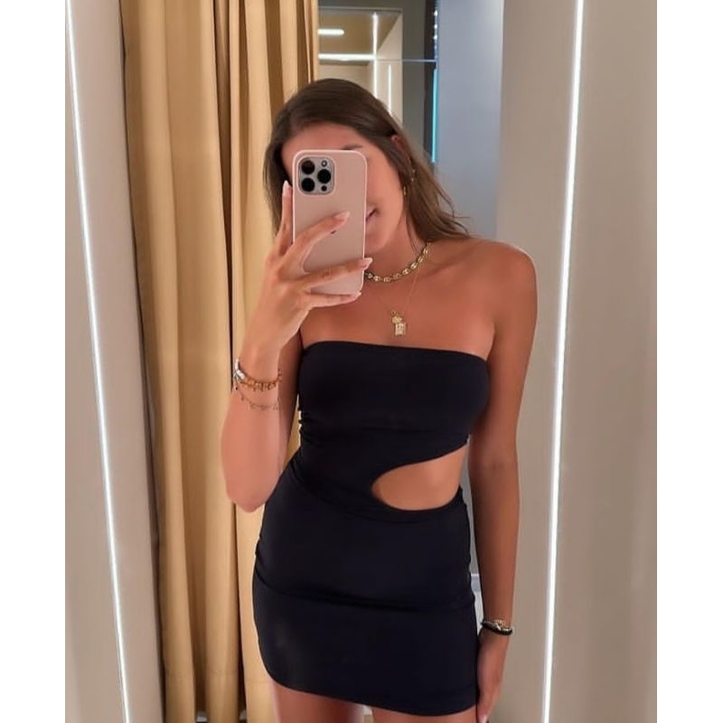 Vestido Feminino Preto Tomara que Caia Racho Fenda na Barriga Lateral Tubinho Curto Moda Blogueira