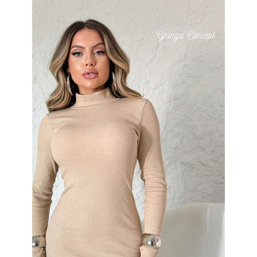 Vestido Golinha Feminino Manga Longa Ribana | Malha Canelada Comfy Moda Gringa Tendência 2025