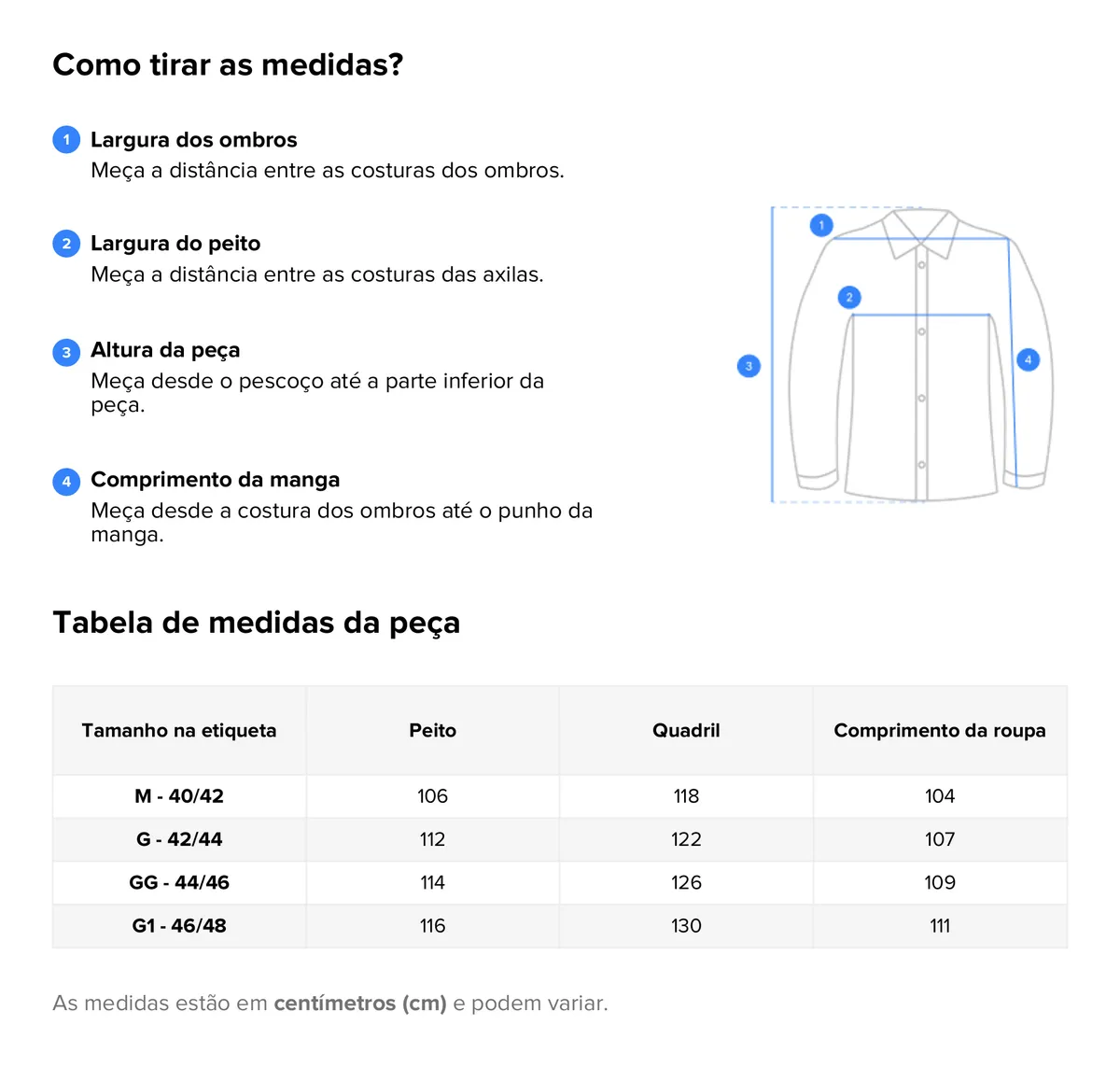 G (veste 42 ao 44): Quadril: 122cm - Busto: 112cm - Comprimento: 107cm.