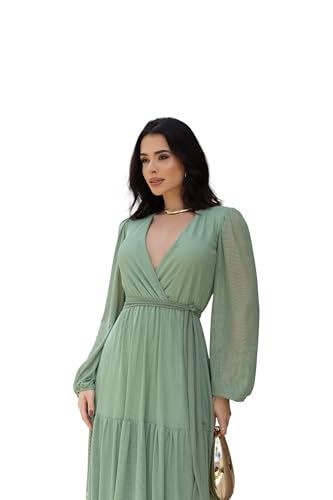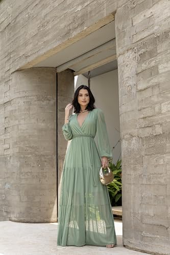 Vestido Longo em tule forrado,manga longa, decote em V, silhueta evasê, elástico + faixa na cintura