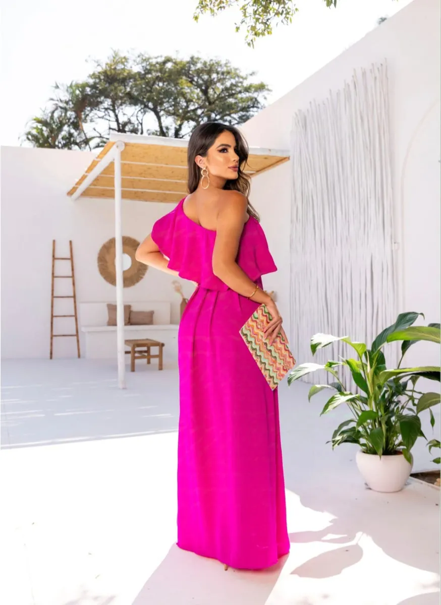 Perfeito para casamentos, jantares, casamento no civil e eventos formais. Feito em tecido Duna Premium, o vestido combina elegância e conforto. Possui uma manga única com detalhe em babado transversal, que adiciona feminilidade à peça.