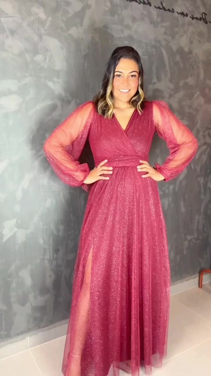 Vestido longo confeccionado em tule com brilho, perfeito para ocasiões especiais como casamentos, formaturas e eventos. Modelo com decote em V, mangas longas com leve transparência, cintura marcada e saia fluida com fenda frontal coberta pelo tule, garantindo elegância e um toque de sensualidade discreta.