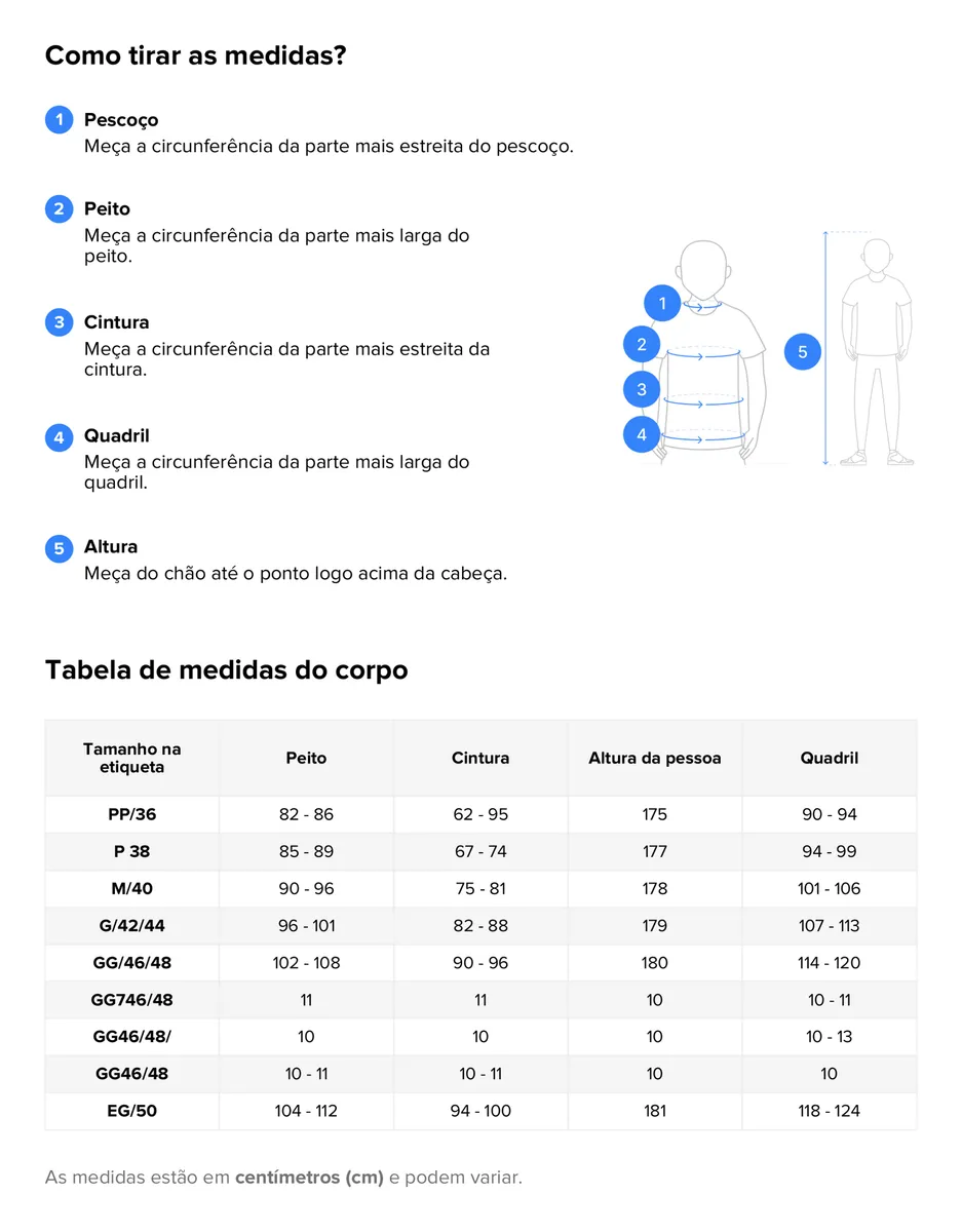 P 38 Busto 85cm a 89cm Cintura 67cm a 74cm Quadril 94cm a 99cm